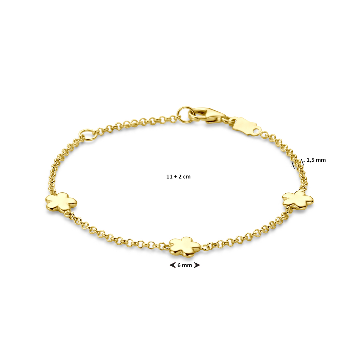 14k Geelgouden armband uitgevoerd met bloemen. De armband heeft draaglengtes van 11-13cm. Uitgevoerd met karabijnsluiting.