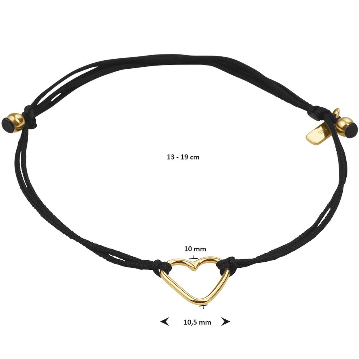 Zwart gevlochten armband uitgevoerd met een 14k geelgouden open hartje. De armband heeft draaglengtes van 13 tot 19cm. Het hartje heeft een afmeting van 10x10.5mm.