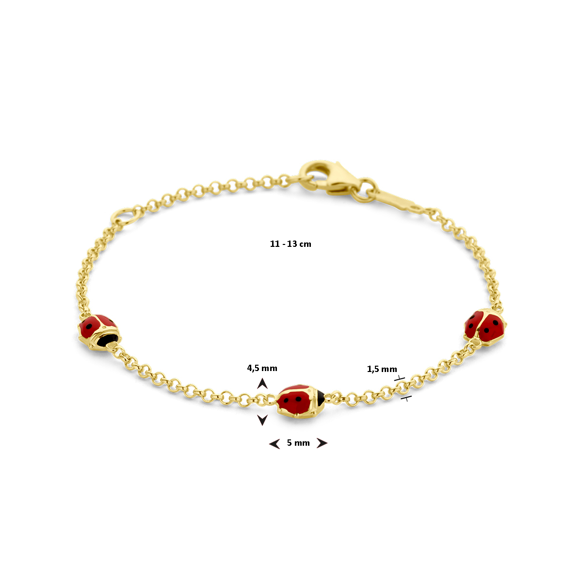 14k Geelgouden armband uitgevoerd met drie lieveheersbeestjes. De armband heeft een schakelbreedte van 1.5mm en draaglengtes van 11 en 13cm. Uitgevoerd met karabijnsluiting.