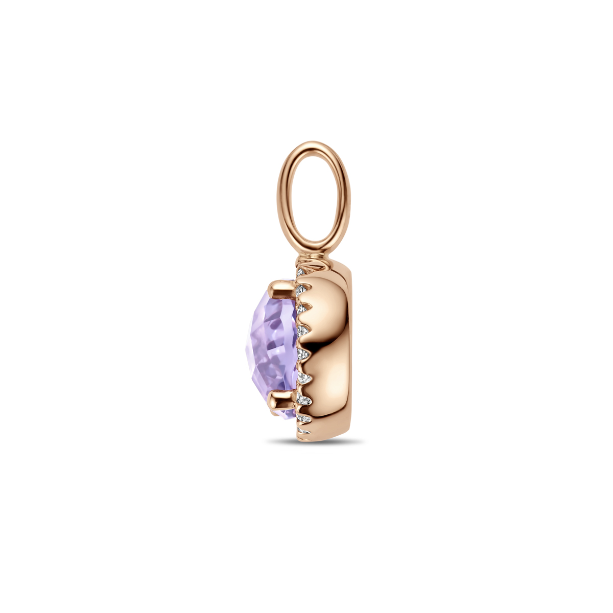 14k Roségouden hanger uitgevoerd met amethist en diamant. De hanger heeft een afmeting van 17x10.5mm. Het diamantgewicht is 0.09ct.