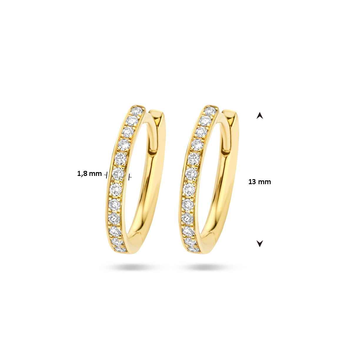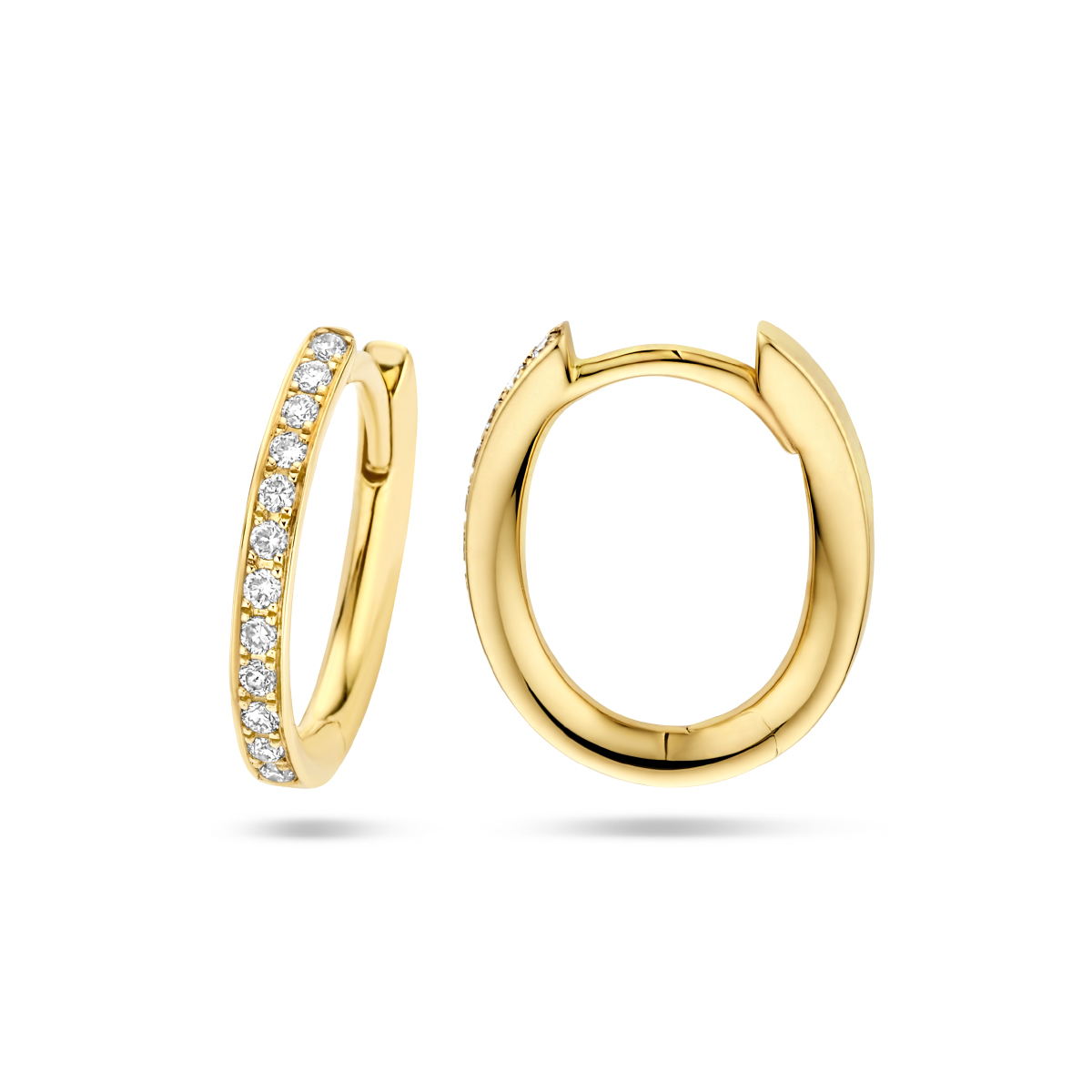 Beschrijving: Schitterend! Dat gaat iedereen vast zeggen van deze 14k geelgouden oorringen. Aan de voorzijde is een rij transparante witte diamanten geplaatst, met een totaal steengewicht van 0,14 karaat. De ovale oorring kan gemakkelijk in en uit gedaan worden door het scharnier.